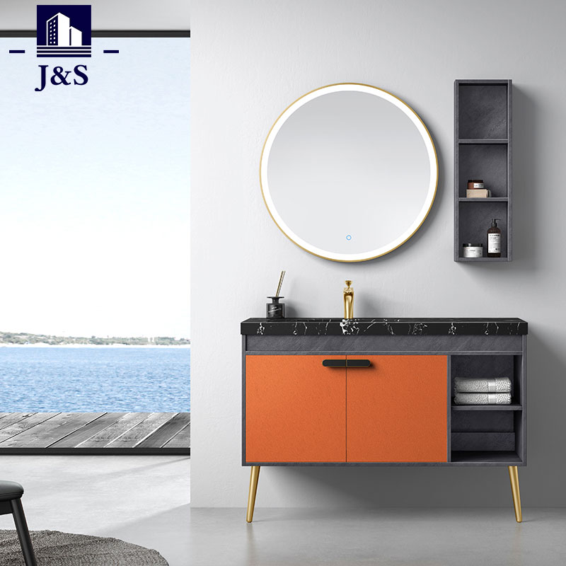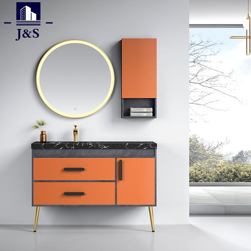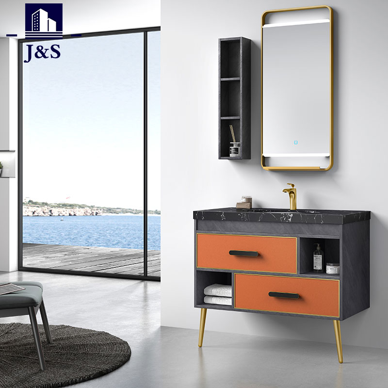 Supplevimus tabulatum stantem Bathroom Cabinet Bath Vanity. Hoc est color aureus in balneo vanitatis cum manubrio aureo consilio, distinctivo et celeberrimo.